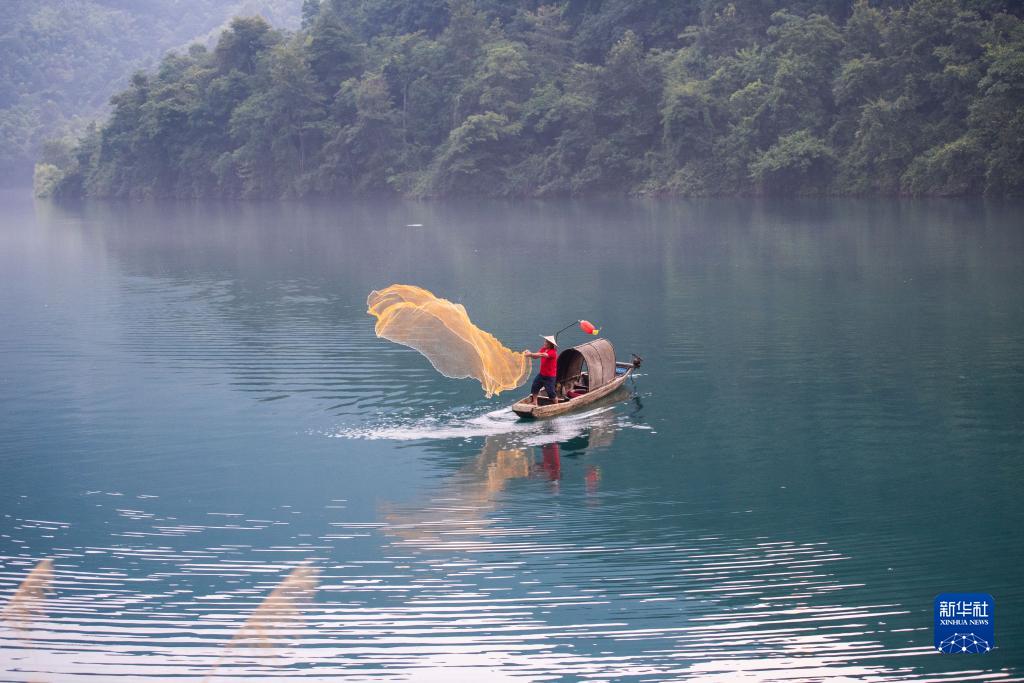 8月9日,在資興市東江湖風(fēng)景區,漁夫在進(jìn)行撒網(wǎng)表演。