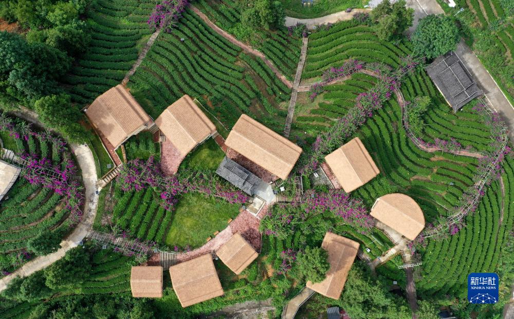 這是融水苗族自治縣融水鎮新安村水融香茶園茶葉種植基地(無(wú)人機照片,8月9日攝)。民宿、花廊、茶文化體驗館等文旅設施位于茶山上。