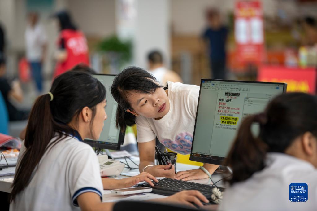 8月9日,在浙江省金華市婺城區零工服務(wù)中心大廳里,工作人員幫助求職者查找用工信息。