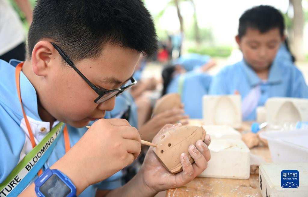 研學(xué)學(xué)生在西安半坡博物館里制作陶塤(8月9日攝)。