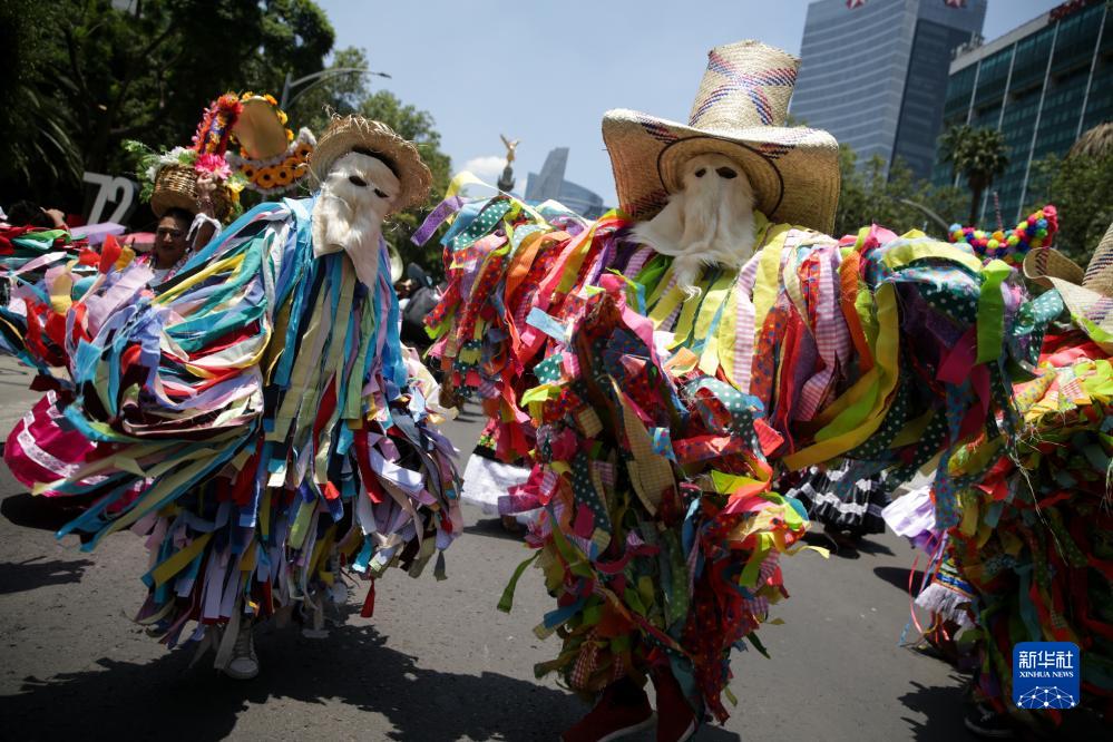8月9日,在墨西哥首都墨西哥城,演員身著(zhù)傳統服飾參加世界土著(zhù)人民國際日慶?;顒?dòng)。