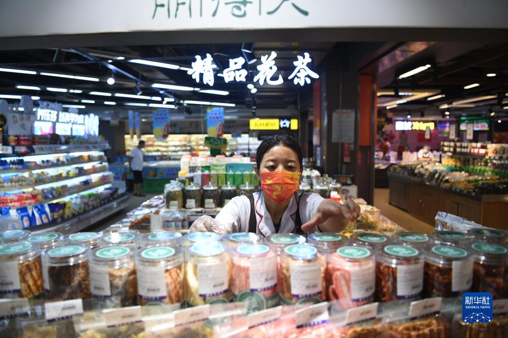 8月10日,涿州市惠友超市鉆石廣場(chǎng)店工作人員在貨臺整理商品。