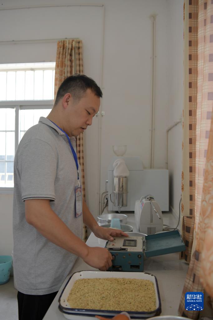 在江西省南昌縣橫崗國家糧食儲備庫,工作人員通過(guò)設備檢測抽樣糧食的水分、品質(zhì)、農藥殘余、重金屬等情況(8月8日攝)。