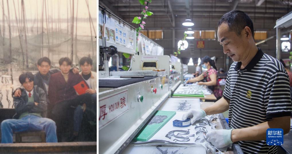 拼版照片:左圖為1998年,湖北洪湖漁民陳玉祥(左一)與朋友在船上(資料照片);右圖為2023年7月21日,陳玉祥在湖北洪湖一家鞋業(yè)公司工作(新華社記者 伍志尊 攝)。