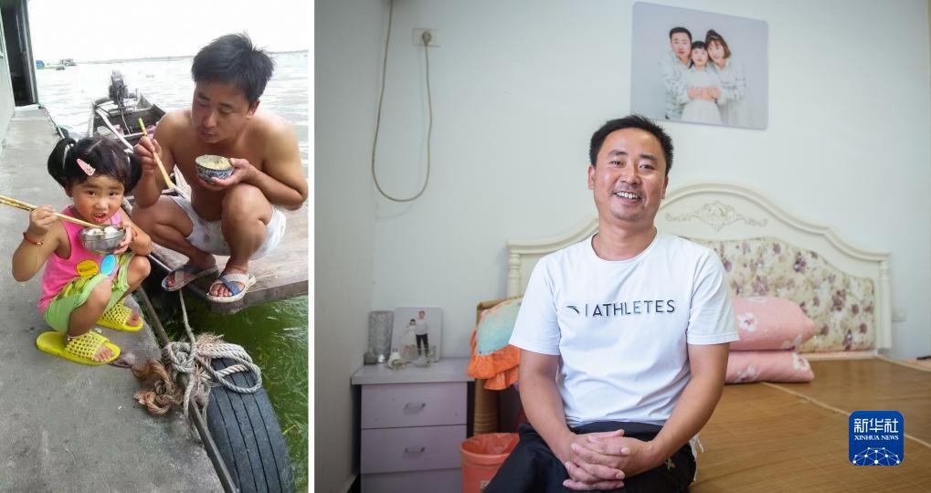 拼版照片:左圖為湖北省洪湖市船頭嘴村漁民李金存和女兒在一起(資料照片);右圖為2023年7月21日,李金存在家中留影(新華社記者 伍志尊 攝)。