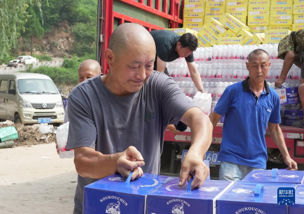 8月10日,在淶水縣龍門(mén)鄉,村民將捐贈的食品和飲用水卸車(chē)。