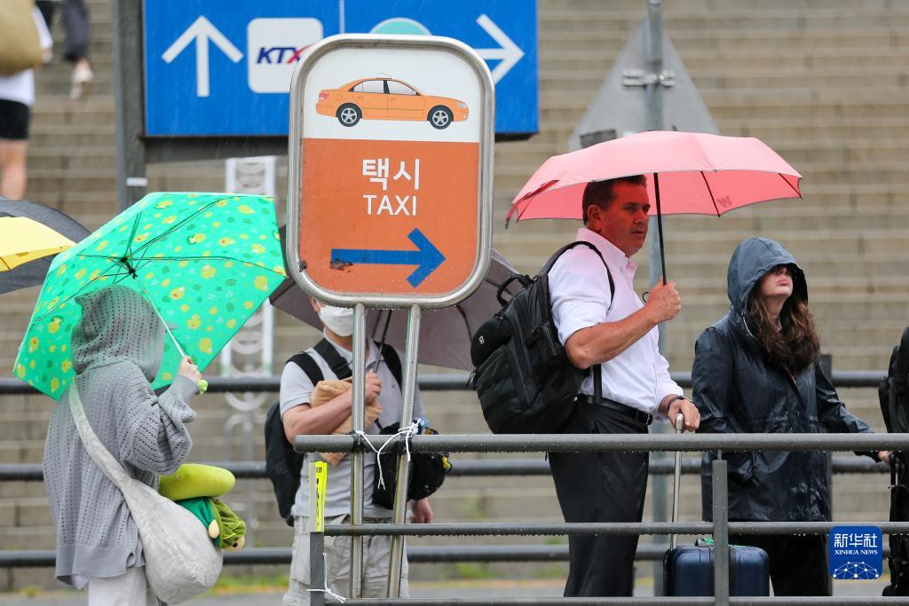 8月10日,在韓國首爾站外,人們在雨中排隊等出租車(chē)。