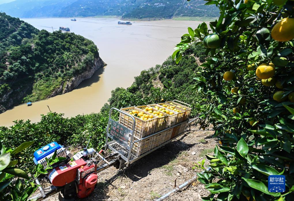 8月10日,秭歸縣泄灘鄉坊家山村村民用田間單軌運輸機轉運柑橘。