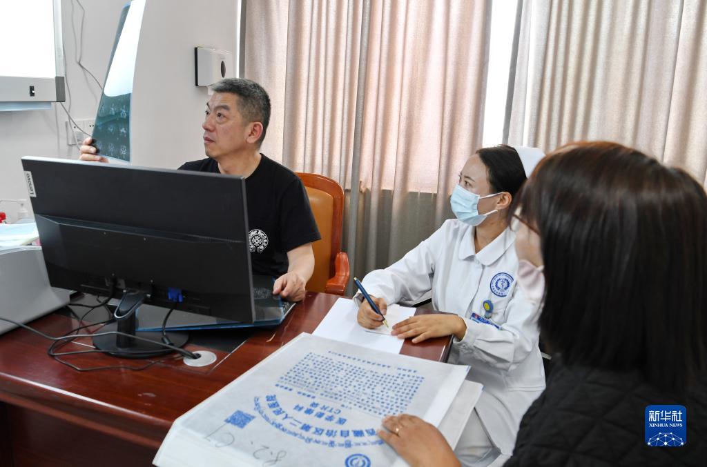 8月10日,北京天壇醫院神經(jīng)外科學(xué)中心主任醫師隋大立(左)和西藏自治區第二人民醫院的醫生為患者義診。