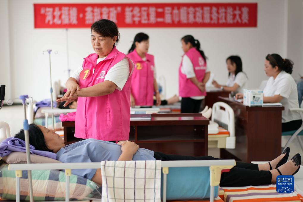 8月11日,在河北省滄州市新華區巾幗家政服務(wù)技能大賽比賽現場(chǎng),參賽人員展示養老護理技能。