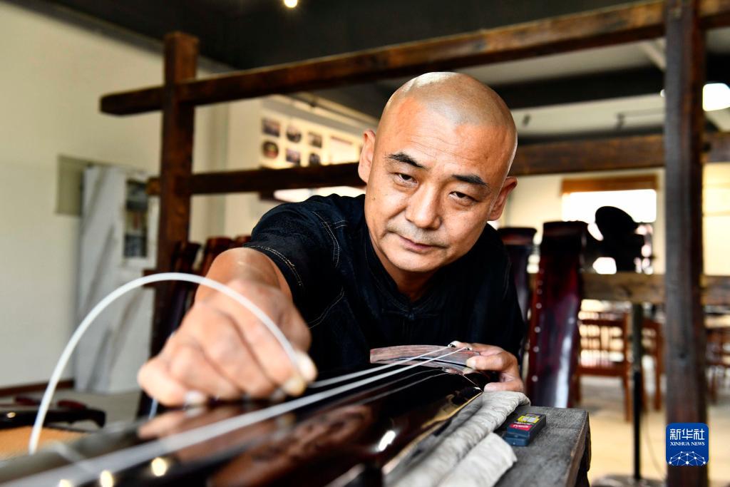 8月10日,在棗莊市市中區傳統古琴制作非遺工坊,非遺傳承人謝愛(ài)軍在制作古琴。
