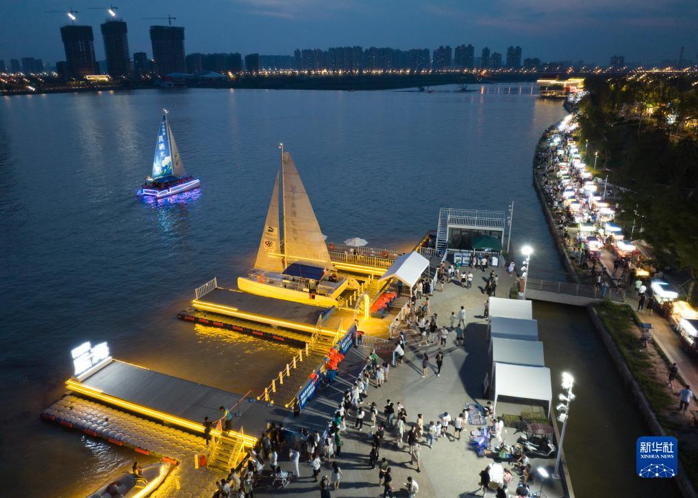 游人在西安市浐灞生態(tài)區一處游船碼頭和后備箱集市上游覽(8月10日攝,無(wú)人機照片)。
