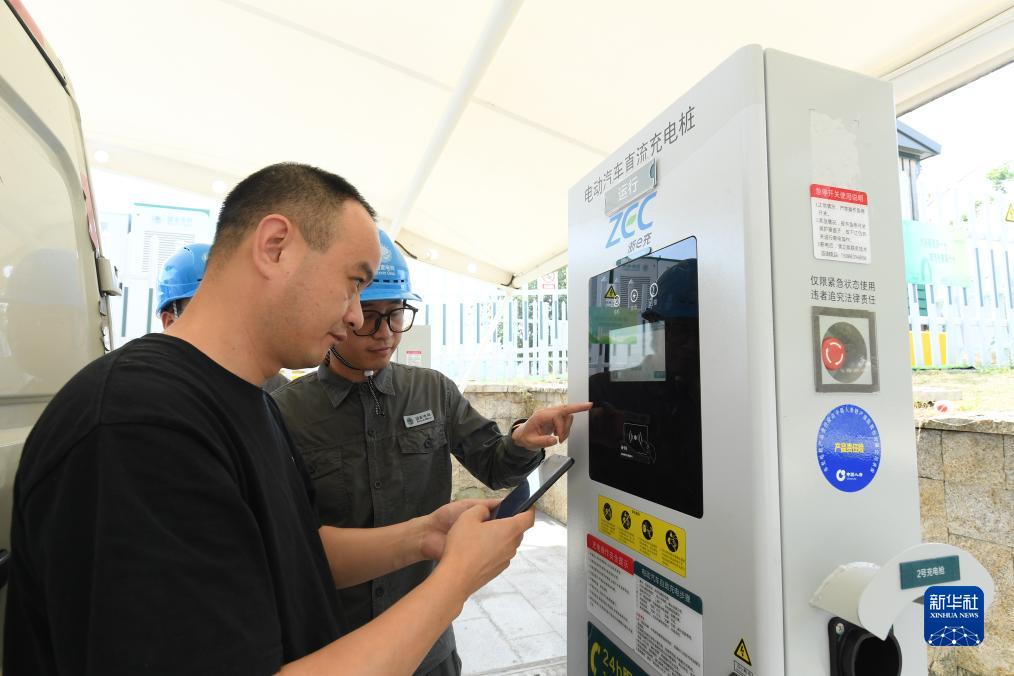 8月11日,游客在安吉余村一處停車(chē)場(chǎng)為電動(dòng)車(chē)充電。