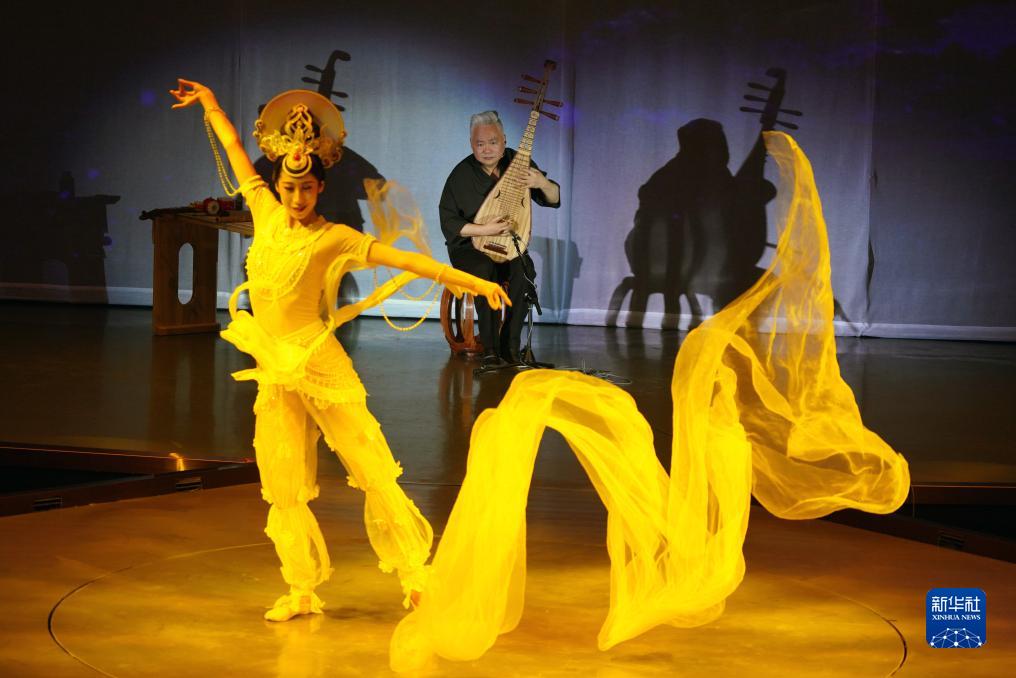 8月9日,在《樂(lè )動(dòng)敦煌》演出現場(chǎng),敦煌古樂(lè )全球推廣大使、國樂(lè )藝術(shù)家方錦龍演奏琵琶,為舞蹈演員伴奏。