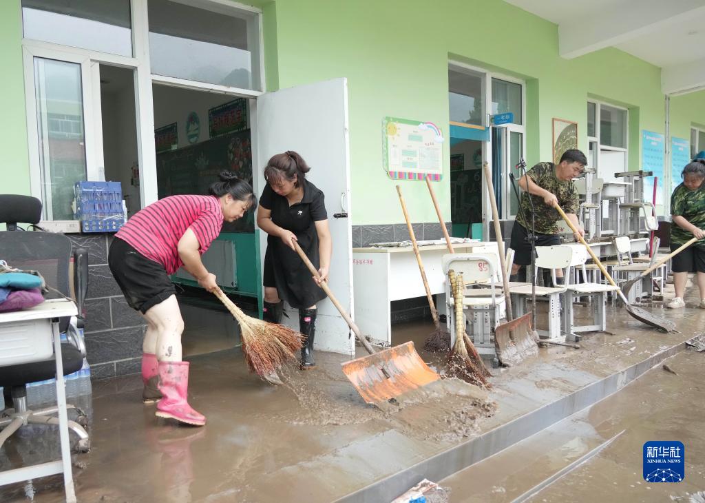 8月11日,在河北省淶水縣其中口鄉,學(xué)校老師在清洗教室。