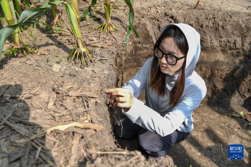 7月31日,在位于吉林省四平市梨樹(shù)縣的中國農業(yè)大學(xué)“科技小院”試驗田,在讀碩士生張凈然查看作物根部生長(cháng)情況。