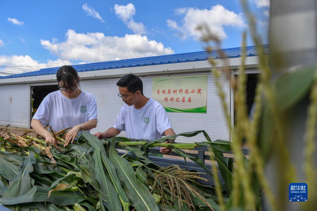 8月10日,在位于吉林省四平市梨樹(shù)縣的中國農業(yè)大學(xué)“科技小院”,在讀博士生胡文朗(右)和在讀碩士生張凈然查看作物樣本。