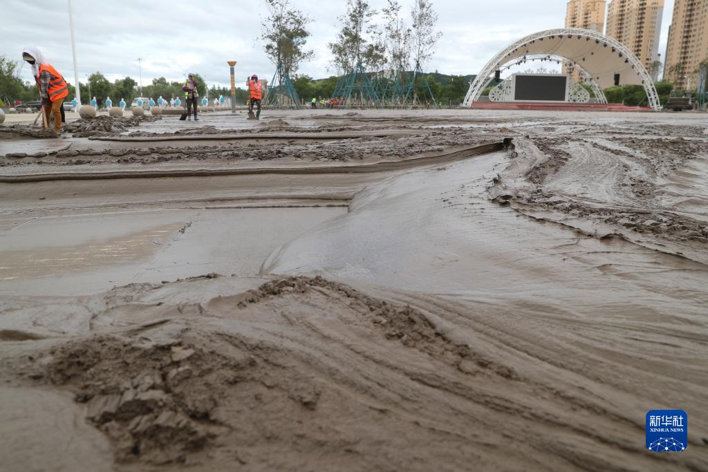 8月11日,在黑龍江省尚志市尚志大街附近,環(huán)衛工人在清理淤泥。