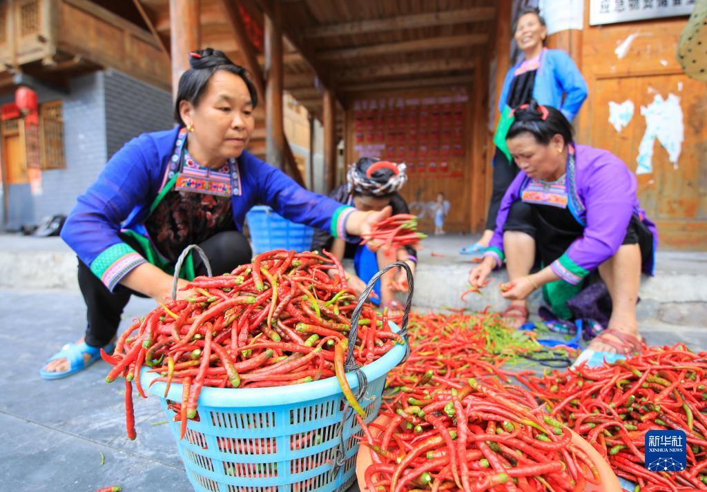8月11日,在貴州省黔東南苗族侗族自治州從江縣往洞鎮增沖村,村民在分揀辣椒。