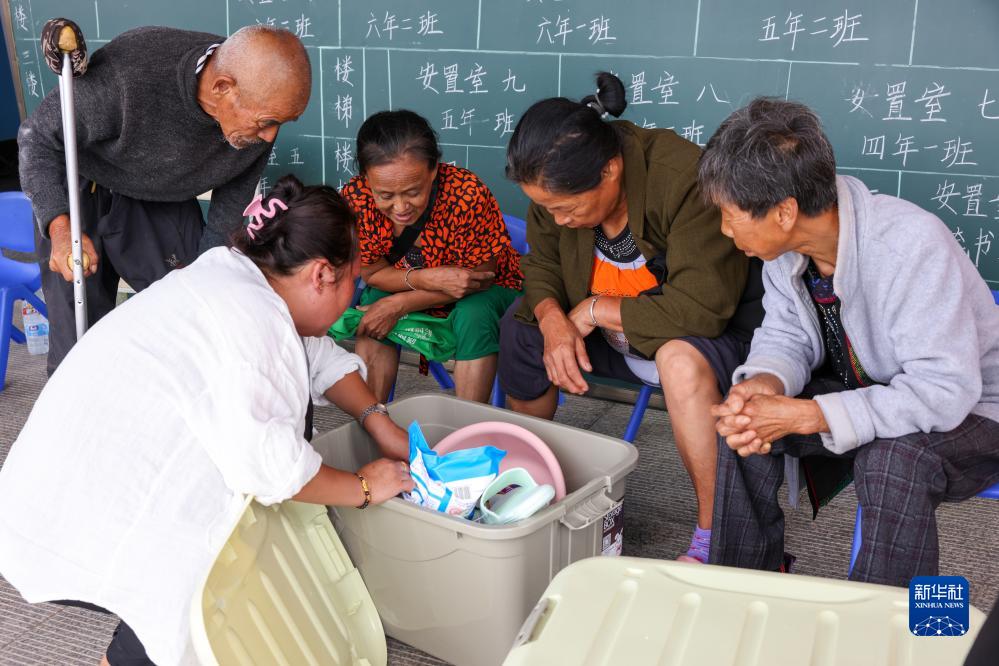 8月10日,在吉林省舒蘭市開(kāi)原鎮上的舒蘭中心校居民安置點(diǎn),居民查看申領(lǐng)的生活用品。