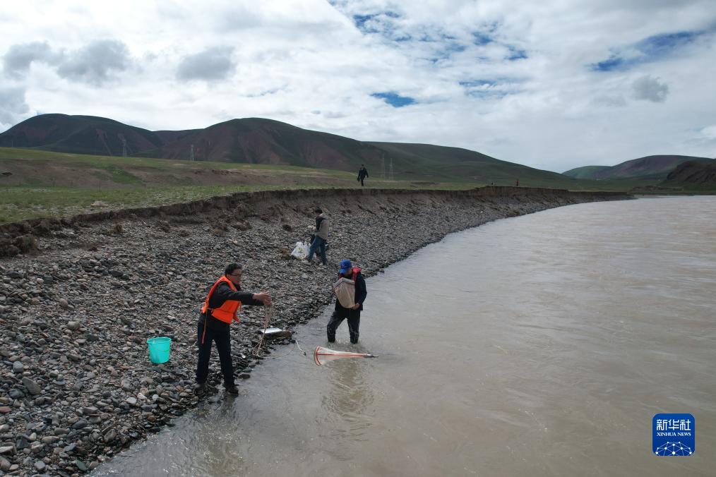科考隊員在長(cháng)江源辮狀河道進(jìn)行科考作業(yè)(7月26日攝)。