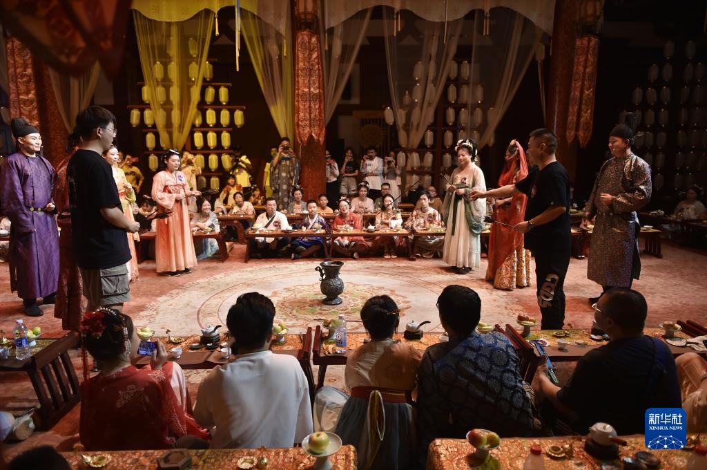 8月11日晚,游人在洛陽(yáng)應天門(mén)遺址博物館內和演員參加互動(dòng)游戲。