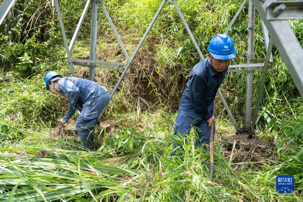 8月10日,鄧一強(右)和姚證強在清理10千伏浦寨Ⅱ線(xiàn)19號塔塔基附近的雜草,查看塔基的情況。新華社記者 費茂華 攝