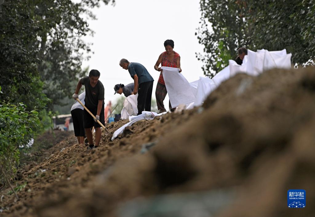 8月10日,在天津市靜海區大清河臺頭段南堤,抗洪人員在加固堤壩。