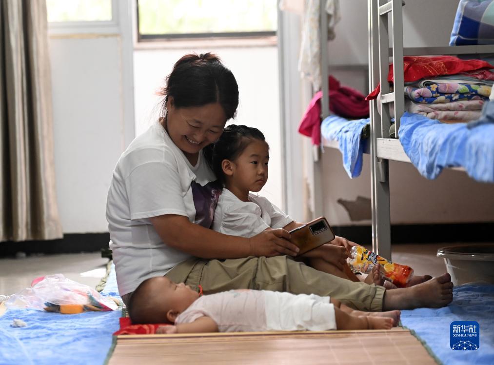 8月12日,在天津市靜海區大邱莊中學(xué)集中安置點(diǎn),轉移群眾在宿舍內照看孩子。