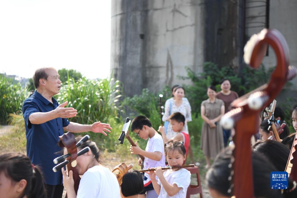 8月12日,李舒尤(左一)在枧頭洲村戶(hù)外指揮學(xué)生們合奏。