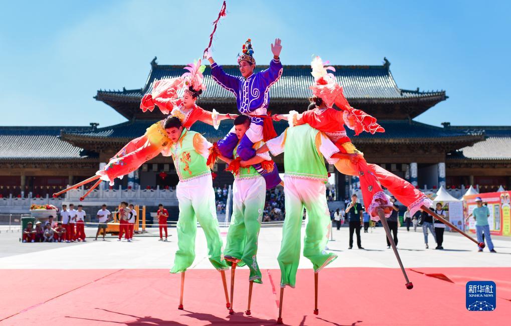 8月13日,在鄂爾多斯文化產(chǎn)業(yè)園景區,民間藝人表演海城高蹺。