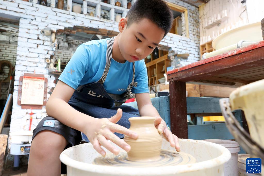 8月13日,小學(xué)生在福建省福州市長(cháng)樂(lè )區吳村村陶源里文創(chuàng )街區學(xué)習制作陶藝作品。