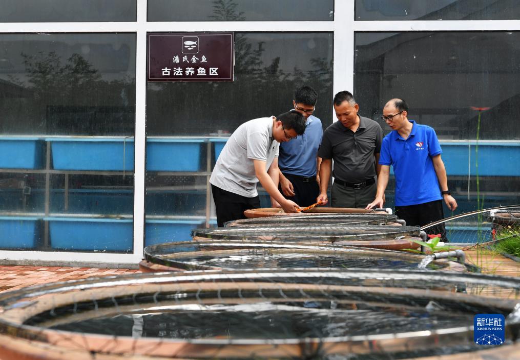 這是在福州市閩侯縣荊溪鎮關(guān)中村潘氏金魚(yú)養殖基地,福建省科技廳、福州市科技局選派的科技特派員團隊與養殖場(chǎng)負責人潘國誠(右二)在養殖場(chǎng)里探討金魚(yú)養殖技術(shù)(8月11日攝)。