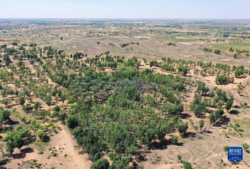 這是曹扎娃在毛烏素沙地中的承包地,現在變成了一片樹(shù)林(6月14日攝,無(wú)人機照片)。