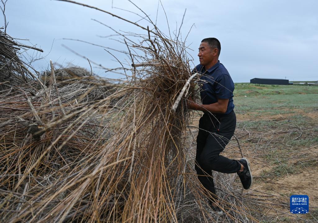 8月11日,內蒙古達拉特旗官井村村民周志忠在清理沙柳枝條。
