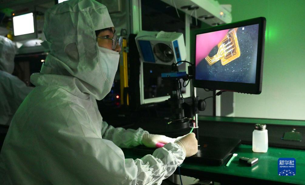 8月14日,在贛州市同興達科技有限公司(金鳳梅園廠(chǎng)區),工作人員在用顯微鏡檢驗產(chǎn)品是否存在焊接不良。