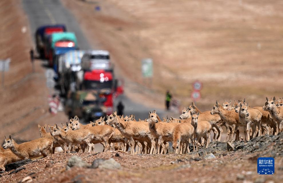 一群待產(chǎn)雌性藏羚羊正在通過(guò)青藏公路前往可可西里卓乃湖產(chǎn)仔(5月29日攝)。