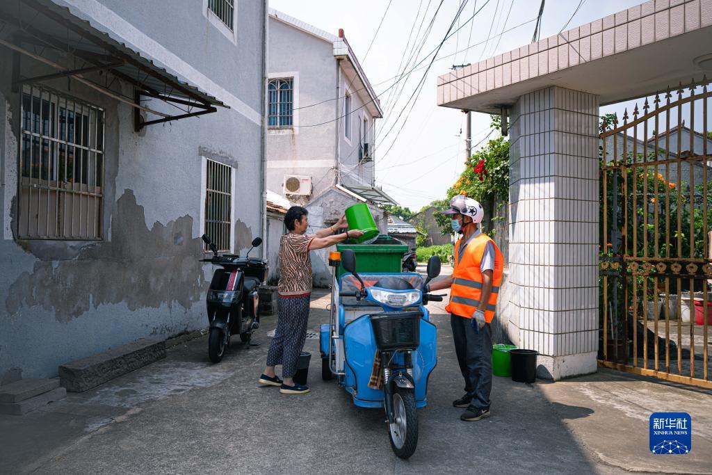寧波市江北區外漕村村民(左)進(jìn)行垃圾分類(lèi)投放(8月11日攝)。