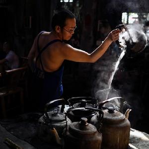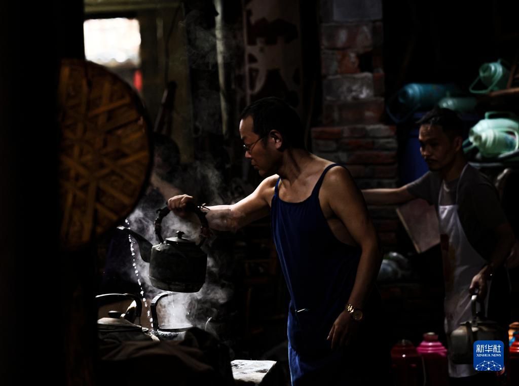 老板李強(左)和伙計為客人準備沏茶的開(kāi)水(8月7日攝)。