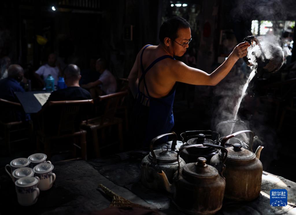 老板李強在給爐灶上的水壺續水(8月7日攝)。