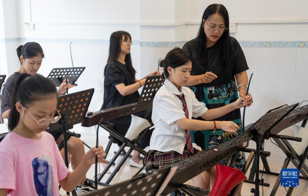 8月13日,東興京族博物館館長(cháng)、獨弦琴傳承人蘇海珍(右一)在指導學(xué)生練習。