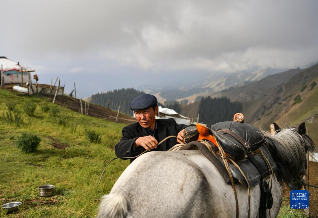 在新疆昌吉市廟爾溝鄉索爾巴斯陶牧場(chǎng)上,一名牧民整理鞍具,準備外出放牧(8月14日攝)。