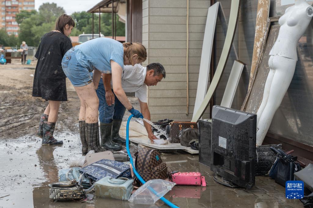 8月15日,在俄羅斯烏蘇里斯克市,人們清洗被洪水浸泡過(guò)的物品。