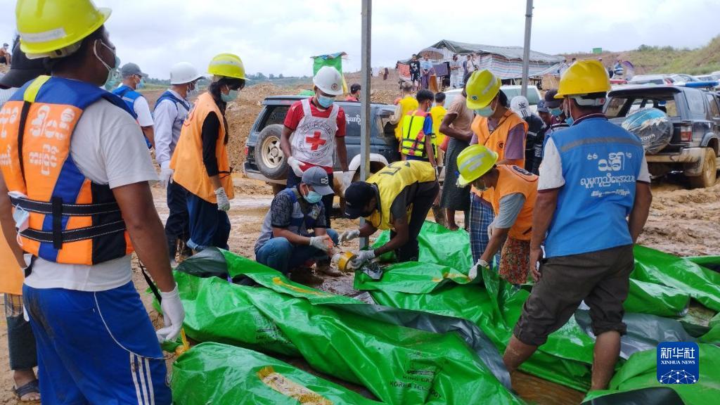 8月15日,在緬甸克欽邦帕甘鎮,救援人員在玉石礦場(chǎng)坍塌事故現場(chǎng)包裹搜救到的遇難者遺體。