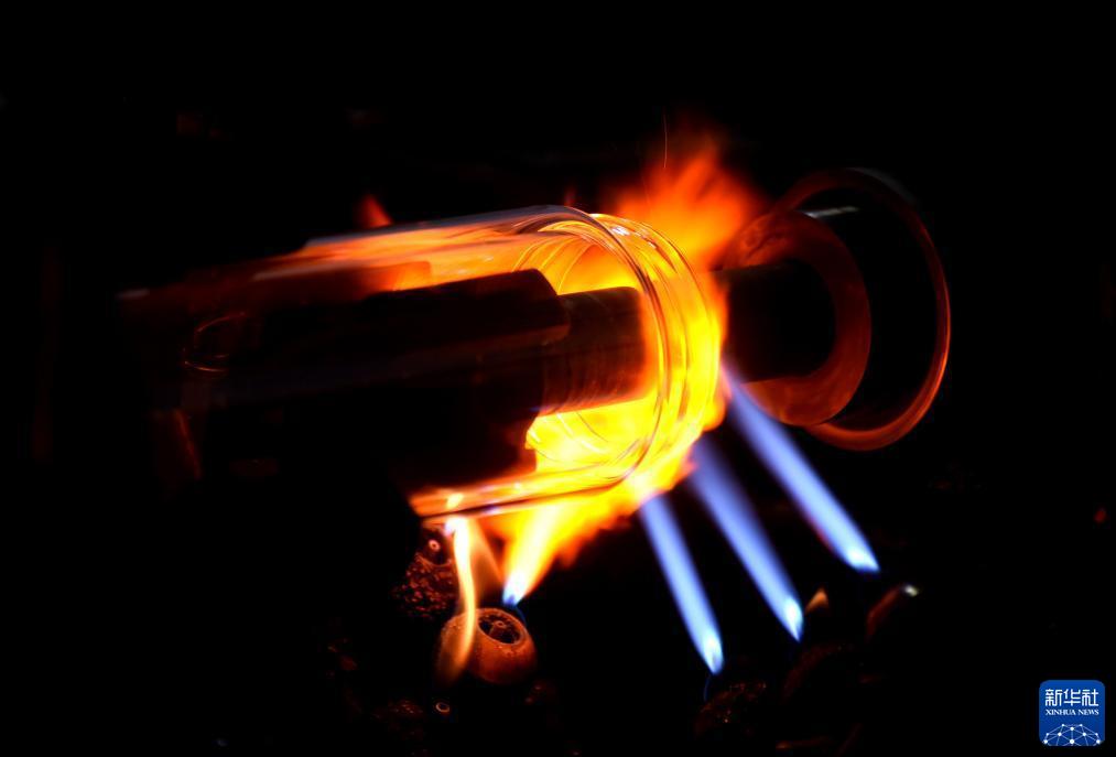 這是8月15日在山東省淄博市沂源縣悅莊鎮東埠村一玻璃制品企業(yè)拍攝的玻璃工藝品燒制加工場(chǎng)景。