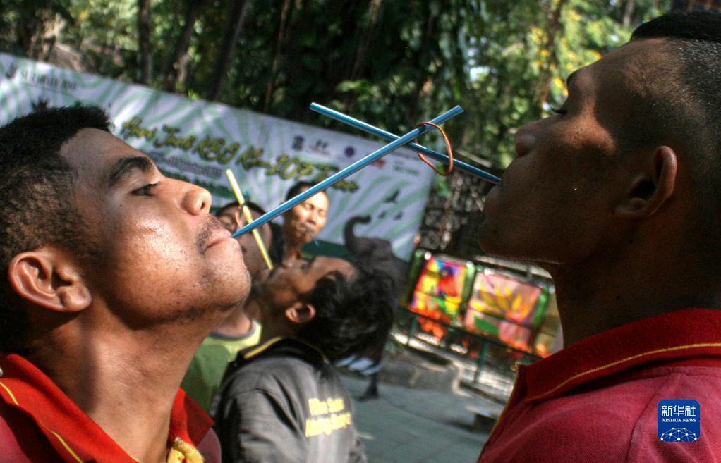 8月15日,在印度尼西亞泗水,人們參加橡皮筋接力趣味游戲,迎接獨立日。