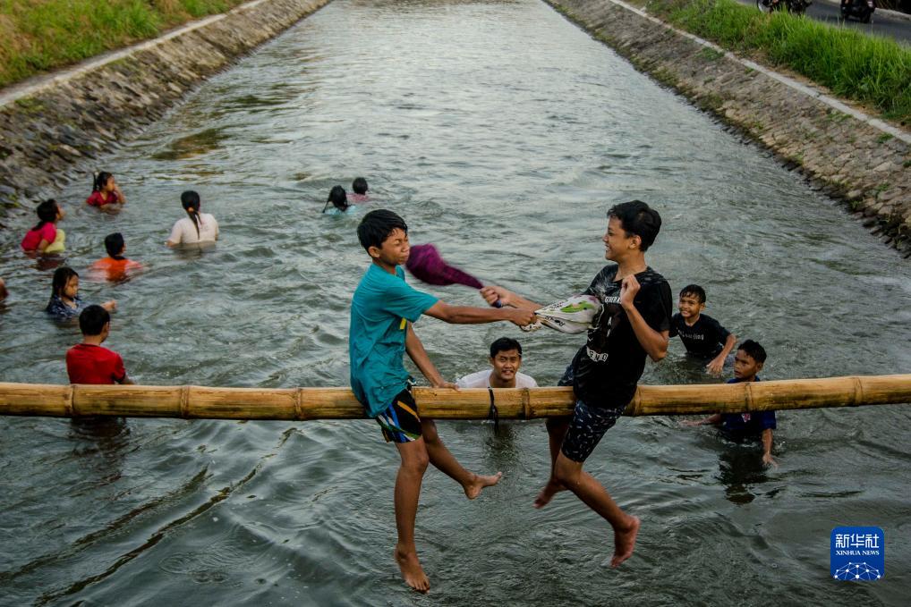 8月15日,在印度尼西亞日惹,孩子們參加“獨木橋枕頭大戰”游戲,迎接獨立日。