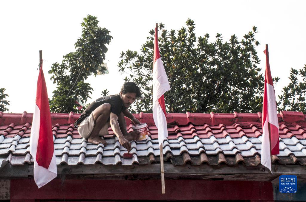 8月14日,在印度尼西亞萬(wàn)隆,一名男子將居民區一棟房子的屋頂瓦片涂成印尼國旗的顏色。