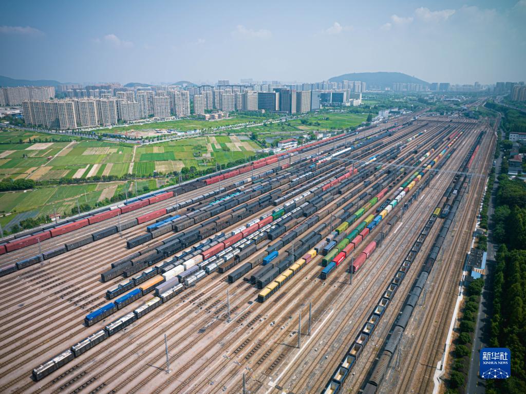 這是8月16日拍攝的位于杭州北郊的鐵路喬司編組站(無(wú)人機照片)。