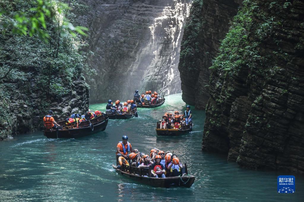 8月16日,游客在屏山峽谷谷底乘船游玩。